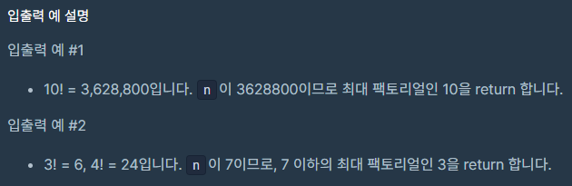 팩토리얼의 값이 n보다 커질때까지 `answer` 를 하나씩 증가시키면서 가장 큰값을 찾는 방식으로 문제를 해결하였습니다.