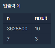 i팩토리얼 (i!)은 1부터 i까지 정수의 곱을 의미합니다. 예를들어 5! = 5 * 4 * 3 * 2 * 1 = 120 입니다. 정수 n이 주어질 때 다음 조건을 만족하는 가장 큰 정수 i를 return 하도록 solution 함수를 완성해주세요.