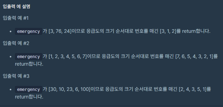 ` emergency` 배열을 내림차순으로 정렬하여 각 요소의 순위를 매기는 방식으로 문제를 해결하였습니다.