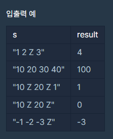 숫자와 "Z"가 공백으로 구분되어 담긴 문자열이 주어집니다. 문자열에 있는 숫자를 차례대로 더하려고 합니다. 이 때 "Z"가 나오면 바로 전에 더했던 숫자를 뺀다는 뜻입니다. 숫자와 "Z"로 이루어진 문자열 s가 주어질 때, 머쓱이가 구한 값을 return 하도록 solution 함수를 완성해보세요.