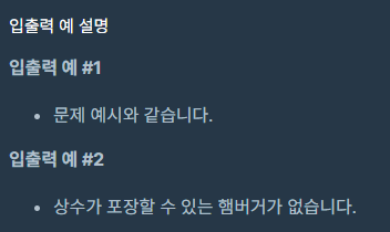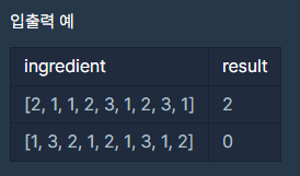 - ingredient의 원소는 1, 2, 3 중 하나의 값이며, 순서대로 빵, 야채, 고기를 의미합니다.