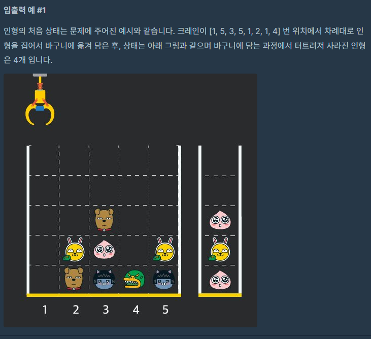 게임 화면의 격자의 상태가 담긴 2차원 배열 board와 인형을 집기 위해 크레인을 작동시킨 위치가 담긴 배열 moves가 매개변수로 주어질 때, 크레인을 모두 작동시킨 후 터트려져 사라진 인형의 개수를 return 하도록 solution 함수를 완성해주세요.