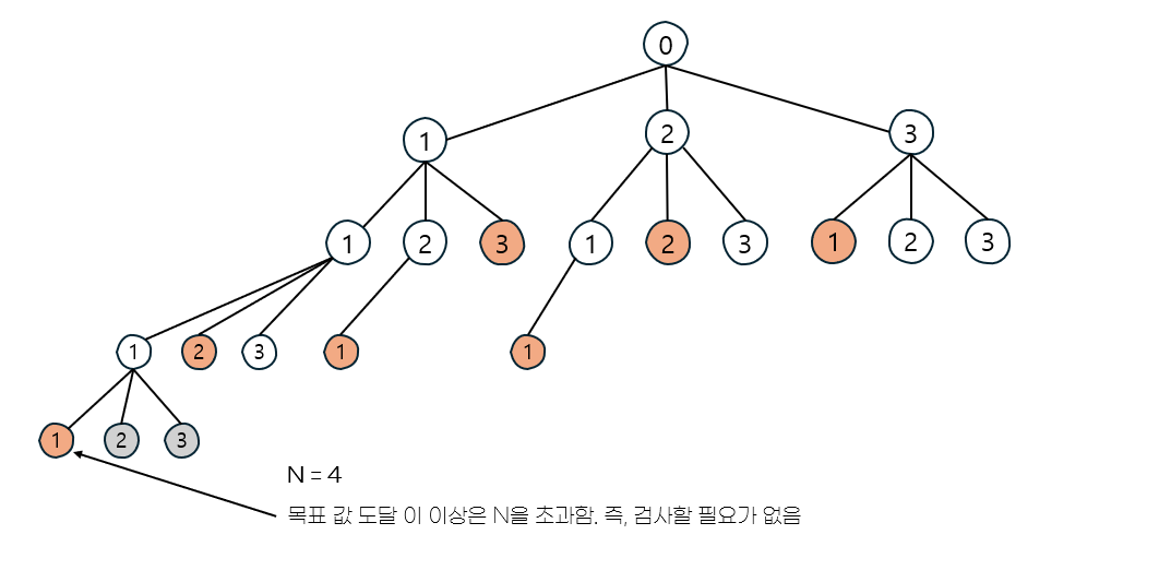 - ๋ง์ฝ ํ์ฌ ํฉ๊ณ๊ฐ `N`๋ณด๋ค ํฌ๋ค๋ฉด ๊ทธ ๊ฒฝ์ฐ๋ ๋ ์ด์ ์งํํ ํ์๊ฐ ์์ผ๋ฏ๋ก ๋ฆฌํดํฉ๋๋ค.