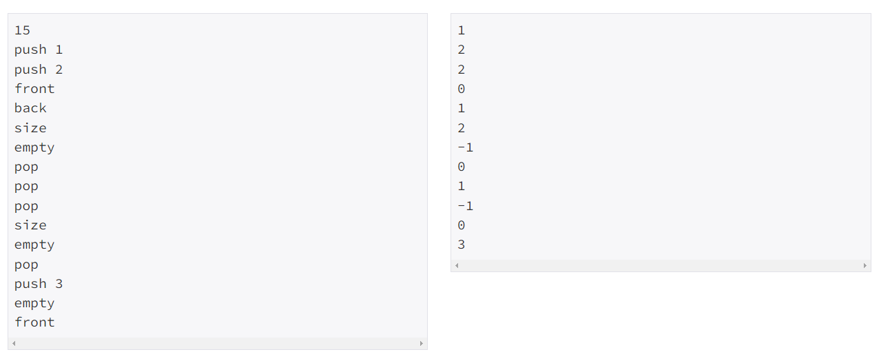 정수를 저장하는 큐를 구현한 다음, 입력으로 주어지는 명령을 처리하는 프로그램을 작성하시오.