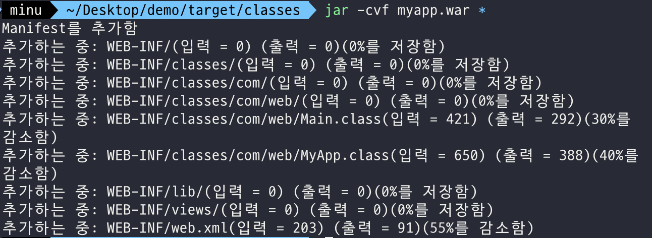 - -f : 출력 파일 이름을 지정한다. myapp.war으로 지정