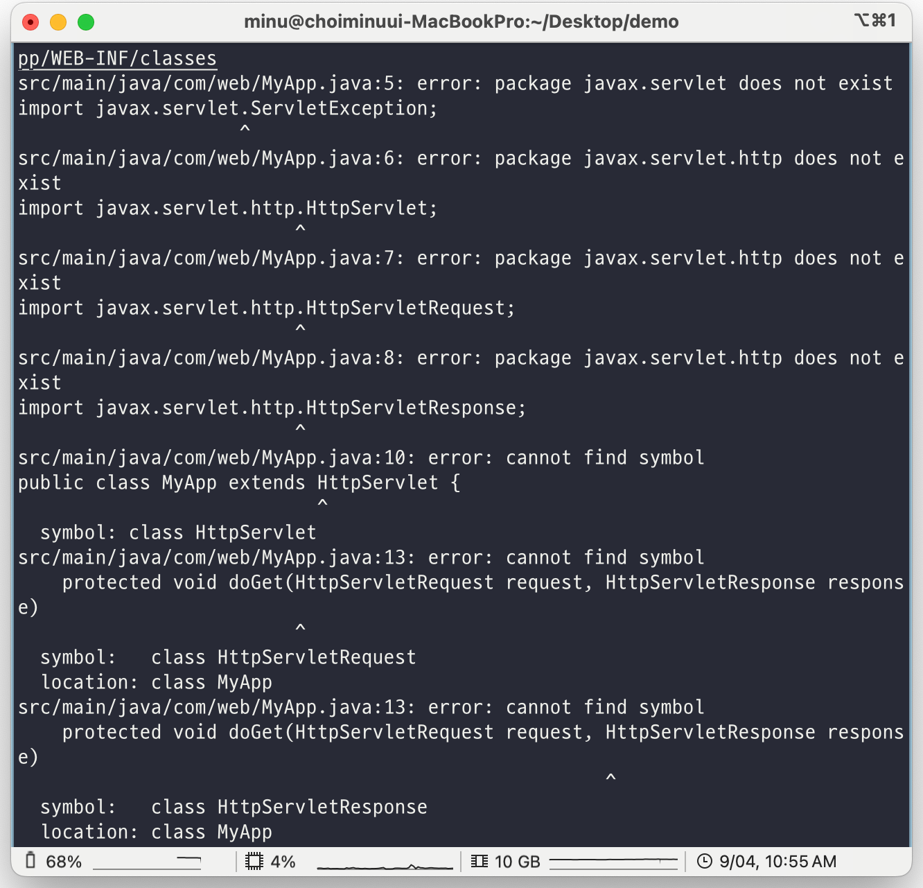 이유는 다음과 같다. MyApp.java 파일에서는 HttpServlet, HttpServletRequest, HttpServletResponse와 같은 서블릿 API 클래스들을 사용한다. 하지만 Java의 기본 라이브러리에는 서블릿 API가 포함되어 있지 않기 때문에, javac 명령만으로 컴파일을 시도하면 서블릿 API가 없어서 javax.servlet 관련 클래스를 찾을 수 없다는 에러가 발생하게 된다.