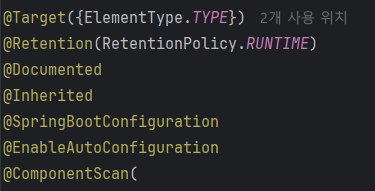 `@SpringBootApplication` 어노테이션은 스프링 부트의 핵심 어노테이션으로, 이 어노테이션을 선언하면 스프링 부트가 자동으로 스프링 컨테이너를 생성하고 애플리케이션을 실행할 수 있도록 해준다. 이 어노테이션을 따라 클래스에 접근하면 내부적으로 `@Configuration`, `@EnableAutoConfiguration`, `@ComponentScan` 어노테이션을 포함하고 있는것을 확인할 수 있다. 따라서 설정 파일을 자동으로 읽고, 빈을 자동으로 등록하며, 필요한 설정을 자동으로 수행한다.