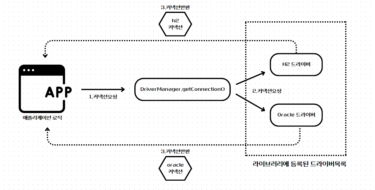 - 애플리케이션 로직은 DriverMnager.getConnection() 메서드를 통해 DB 드라이버를 통해 커넥션을 조회한다.