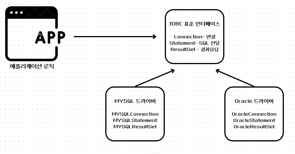JDBC는 java.sql.Connection 이라는 표준 커넥션 인터페이스를 정의해두었고 각각의 데이터베이스 회사들은 이 인터페이스를 구현한Connection 구현체를 제공하기 때문에 위와 같이 동작할 수 있다.