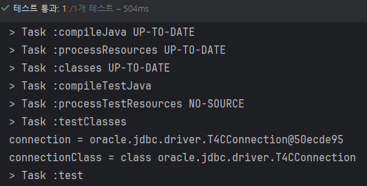 이 코드를 실행한 후 콘솔에 출력된 로그를 보면, 커넥션이 정상적으로 반환된 것을 확인할 수 있다. 로그에는 커넥션 객체와 그 클래스 정보가 출력되며, 이를 통해 데이터베이스와의 연결이 성공적으로 이루어진 것을 확인할 수 있다. 이제 데이터베이스를 Oracle 데이터베이스로 변경해보자.
